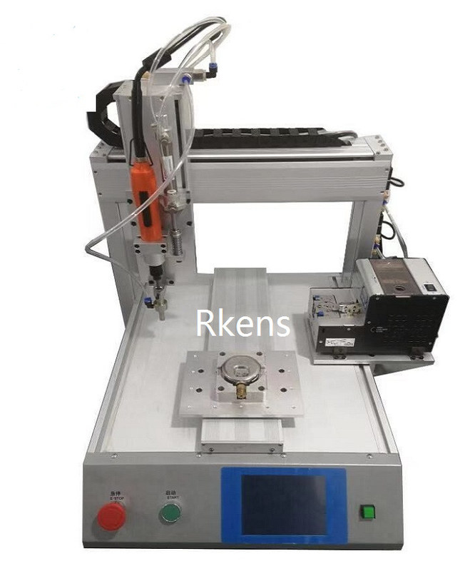 Easy feed and fasten screws for screw assembly. The screw dispenser can feed screws easily , screwdriver will pick up the screws automatically, and fasten screws to required area. Automatic machine with 3 axis, it can be programed easily. English operation language.